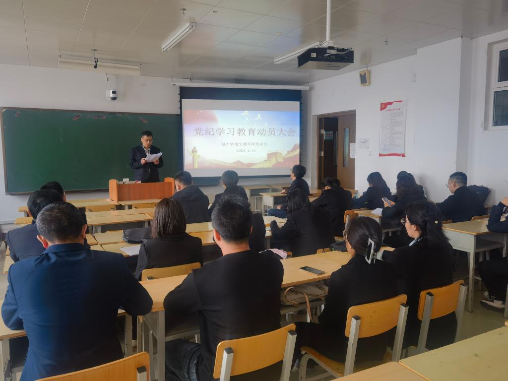 2024年4月15日城市轨道交通学院党总支召开全体党员大会,深入学习贯彻习近平总书记关于党纪学习教育的重要讲话和重要指示精神,全面落实党中央关于开展党纪学习教育的决策部署及传达学校关于开展党纪学习教育方案。教工党支部、学生党支部全体党员参加了会议。会议由党总支副书记李佰玲主持。