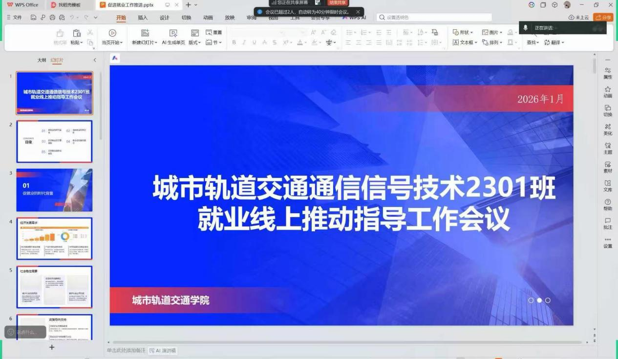 为切实做好寒假期间毕业生就业服务工作,精准帮扶学生明晰就业方向、缓解就业压力,城市轨道交通学院各班级班主任利用寒假居家时间,精心组织线上视频会议,开展寒假促就业暖心帮扶系列活动,以云端相聚的方式,为学生送上就业指导与暖心关怀。
