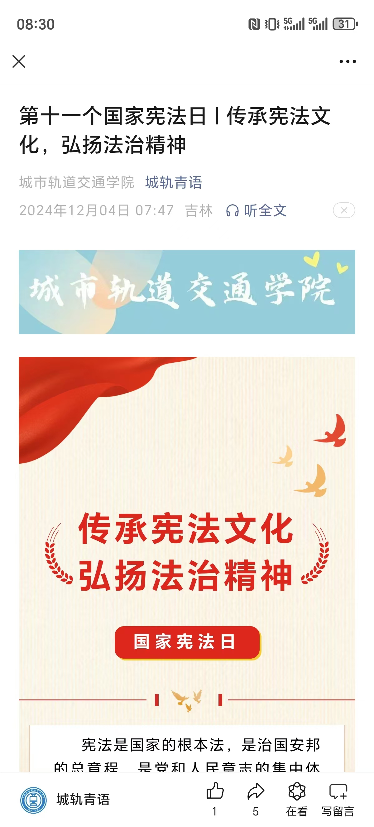 在宪法宣讲方面,通过城轨青语公众号观看宪法知识普及文章和视频,让宪法知识以更加生动的形式呈现给学生。这些内容不仅包括了宪法的基本原则和精神,还涵盖了与学生日常生活息息相关的法律知识。还组织学生参与线上竞答活动不仅极大地巩固了学生们法律知识,还引导他们学法、守法、用法,为构建和谐校园奠定了坚实基础。