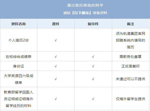 本次校园招聘工作基于轨道集团官网招聘系统进行,请应聘学员登录招聘系统填写简历并进行岗位申报,轨道集团不接受其它投递简历的方式。招聘工作各环节公告、应聘状态、工作安排均在招聘系统中公布或查询,具体招聘流程如下: