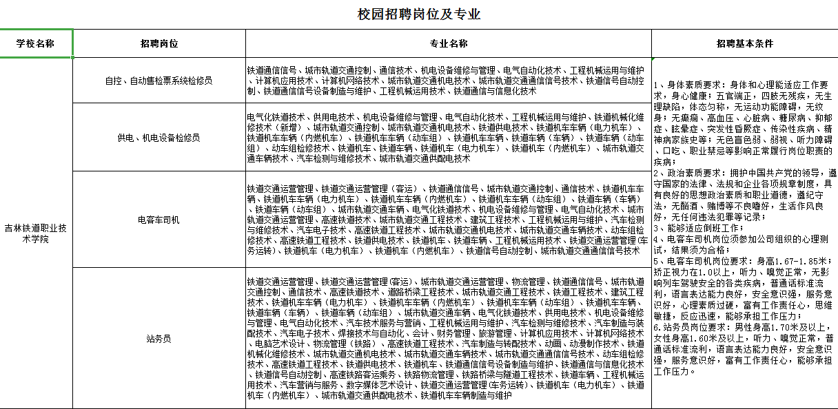 6、站务员岗位要求:男性身高1.70米及以上,女性身高1.60米及以上,听力、嗅觉正常,普通话标准流利,语言表达能力良好,安全意识强,服务意识好,富有工作责任心,能够承担工作压力;