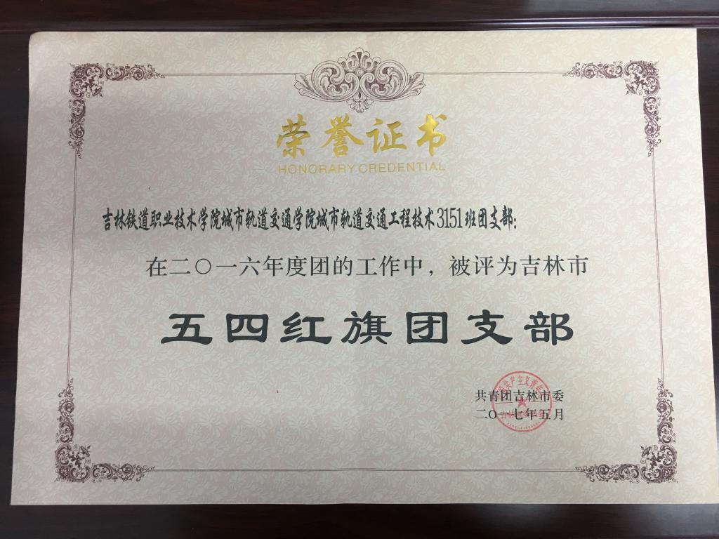 吉林铁道职业技术学院城市轨道交通学院城市轨道交通工程技术3151班在2016年度团的工作中,被评为吉林市“五四红旗团支部”称号。